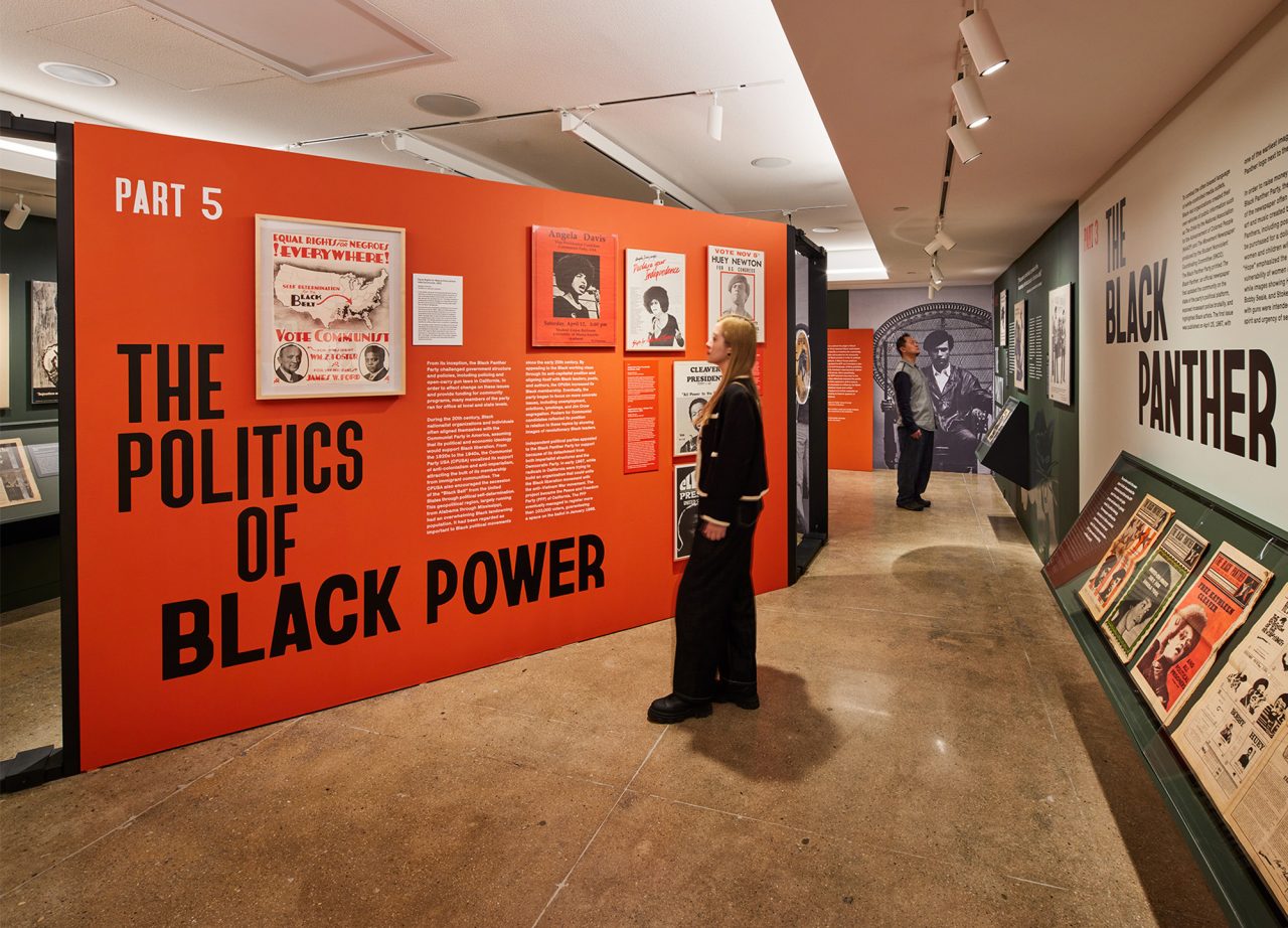 Inside, the exhibit starts with an iconic photograph of Huey Newton (1967) and follows the development of Black Panther branding through six chronological sections.