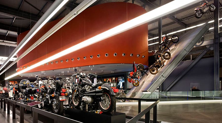 Museum visualization, special exhibits, exhibition hardware, and design services for Harley-Davidson Museum. A destination building in Milwaukee, the museum houses the largest collection of Harley-Davidson motorcycles and artifacts, alongside live event spaces and an interactive archive, all in a state-of-the-art exhibition hall.